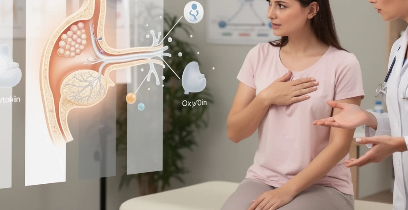 L’ocytocine, responsable du réflexe d’éjection lactée, joue également un rôle déterminant dans la phase de sevrage. Cette neurohormone, produite par l’hypothalamus, facilite normalement l’expulsion du lait des alvéoles mammaires vers les canaux galactophores. Son absence progressive contribue à la stagnation du lait résiduel dans les structures glandulaires.